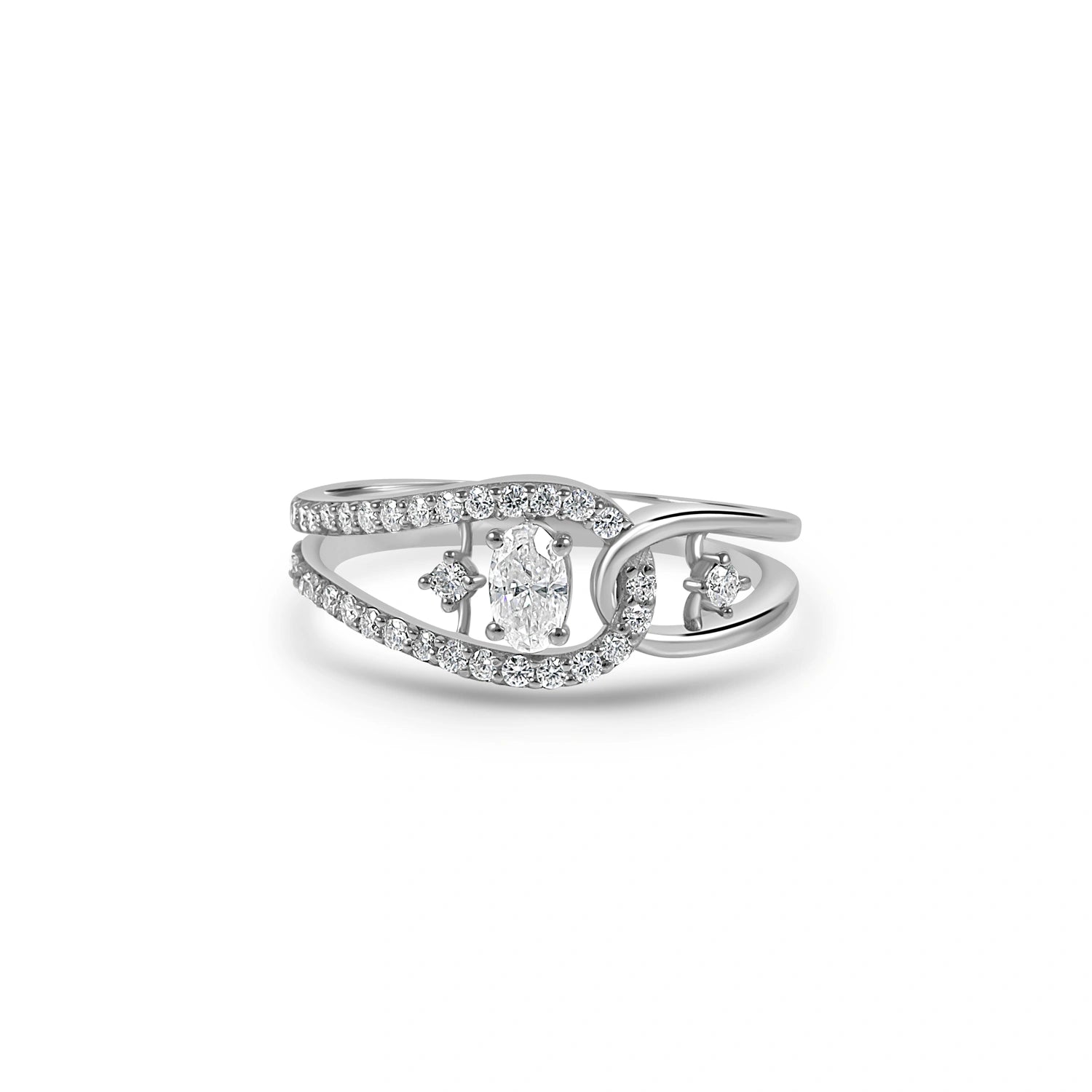The artistic open-loop structure gracefully frames a marquise-cut centerpiece, creating a delicate play of light and luxury. Its fluid dual-band design symbolizes balance and continuity, while the fine detailing adds a sophisticated contemporary touch.